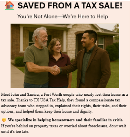 TX USA Tax Help is a proud, locally owned business dedicated to guiding Texas homeowners through the challenges of delinquent property taxes. We understand that losing a home in a county tax auction is never a choice—it’s a crisis. That’s why we provide compassionate, practical support to help families protect their homes and find a path forward.